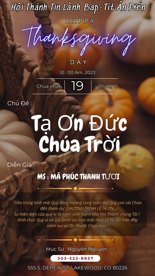 Join us for a heartfelt Thanksgiving Celebration at Vietnamese Grace Baptist Church!Come together in gratitude and praise for God’s abundant blessings, and connect with our welcoming community of faith-filled friends and families. 📍 Location: 555 S. Depew St., Lakewood, CO📞 Contact: +1 720-522-8857 Let’s lift our voices in thanksgiving and share in the joy of